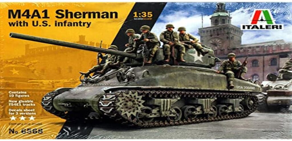 SCALE MODEL: Highly detailed 1/35 scale M4A1(76W) HVSS Sherman tank model kit featuring precise molded details and authentic representation of this iconic WWII vehicle