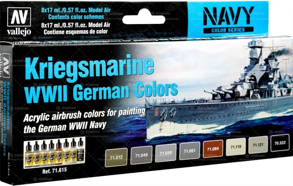 The set consists of 8 bottles of 18 ml (0.60 fl.oz.) and contains the following colors: 70.890 Refractive Green - 70.978 Dark Yellow - 70.879 Green Brown - 70.880 Khaki Grey - 70.872 Chocolate Brown - 70.916 Sand Yellow - 70.862 Black Grey - 70.865 Oily Steel