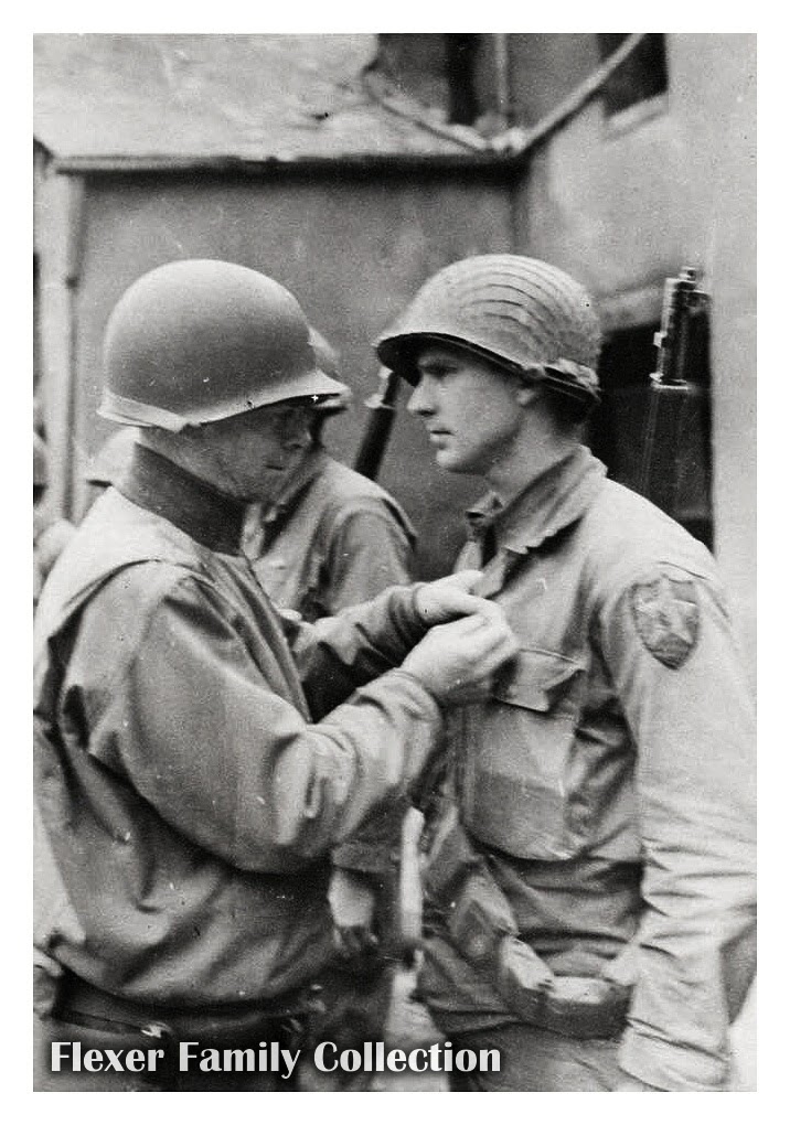 2ID Major General Walter M. Robertson honours S/Sgt. Edwin B. Flexer with the Bronze Star for his action on July 3, 1944. He wears much the same gear as this figure, and you can compare the wrinkling on the clothing, ammo bandoleer and helmet netting favourably with this chap.