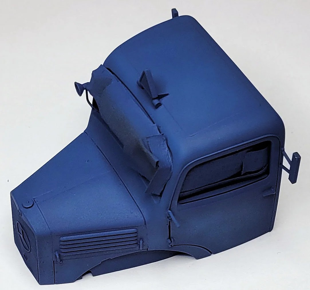 Before painting the bodywork, the barrels, wooden base of the cargo bed and trailer were sprayed in XF59 Desert Yellow, lightened and darkened to give some tonal variation.The wooden areas were then sprayed with AK Worn Effects, after which the cab and bodywork were painted with Tamiya XF-8 Blue. After lightly spraying the blue in various panels, planking, and body panels with white to lighten it up, I then lightly painted between panel lines. Although I had initially used LP-78 for the cab interior the results were not that good (probably due to user-error) and why I opted for XF-8 instead. Using a flat and fairly stiff brush and water, I began scrubbing the bases to reveal the wood colour underneath…
