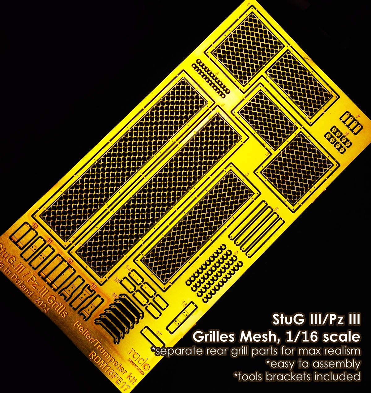 Mesh grilles dedicated for the 1/16th scale StuG and Panzer III kits from Heller or Trumpeter. These are double sided and include tool brackets.ModelsMorris C8 F.A.T. 3D printed wheels (