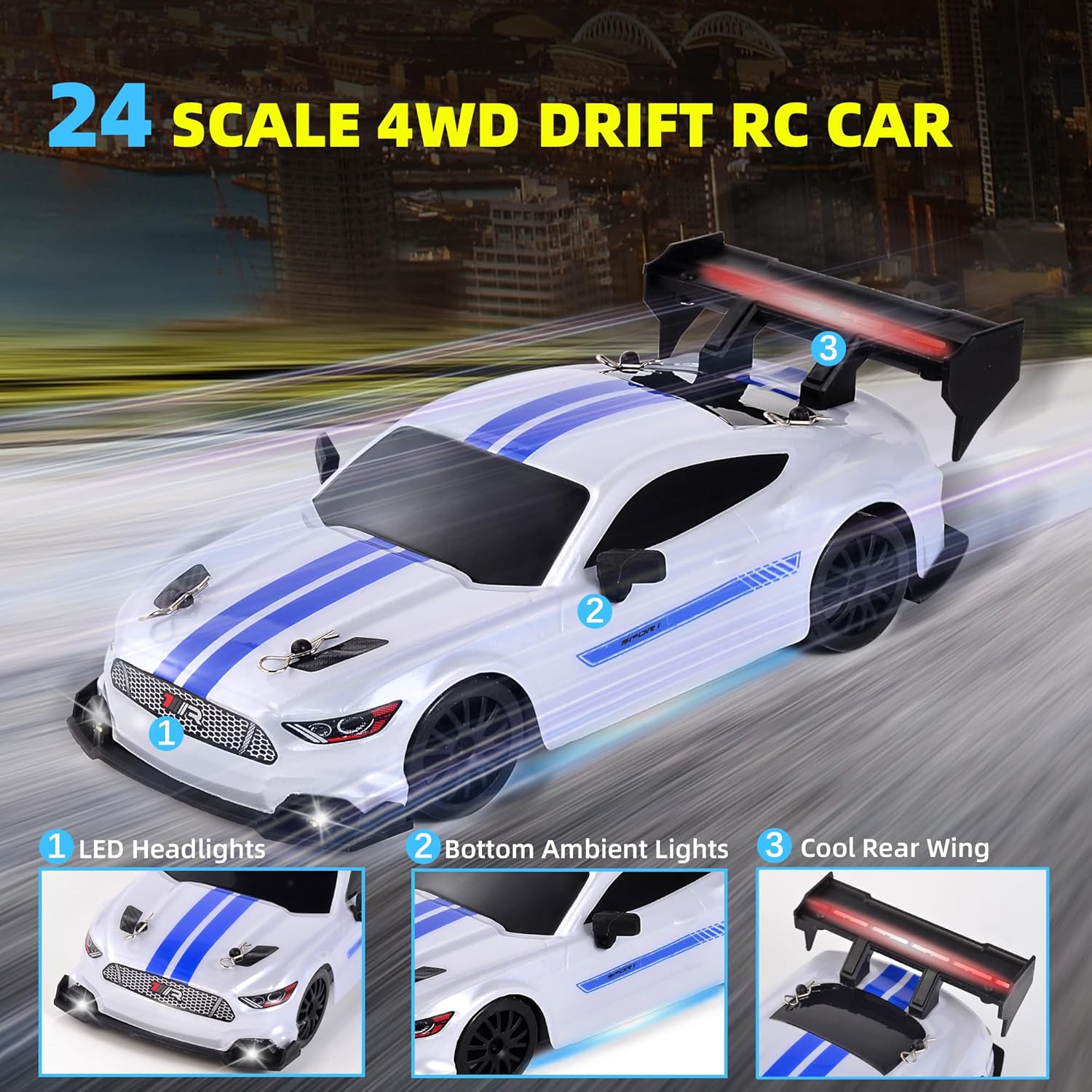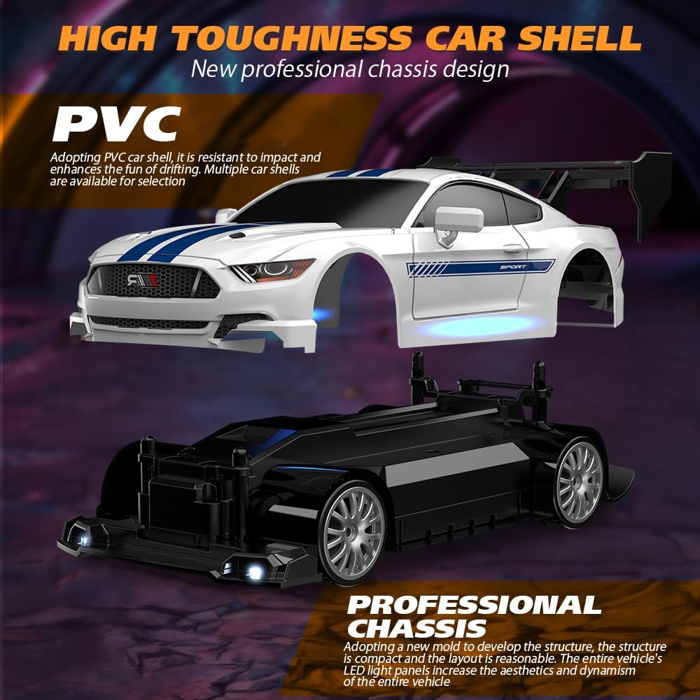 Equipped with headlights, ground lights and taillights to help you find the remote control drift car in the dark. Equipped with headlights, ground lights and taillights, allowing you to quickly find the remote control drift car in the dark