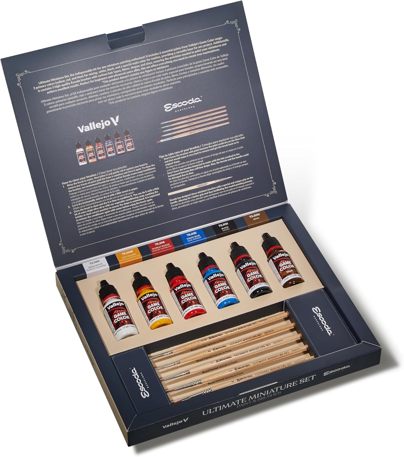 Escoda & Vallejo Present Ultimate Miniature Set – the essential kit for miniature painting enthusiasts! It includes six Vallejo Game Color Paints – Dead White (72.001), Sun Yellow (72.006), Scarlett Blood (72.0106), Magic Blue (72.21), Black (72.051), Sepia Wash (73.2200), which provide a versatile foundation for any project. It also includes 5 Escoda brushes of various sizes, shapes, hair types and fibers. This ensures the accuracy needed to paint miniatures. This set is perfect for both beginners and experienced users. Escoda designed the miniature brushes to have a unique grip that allows for a better painting experience.