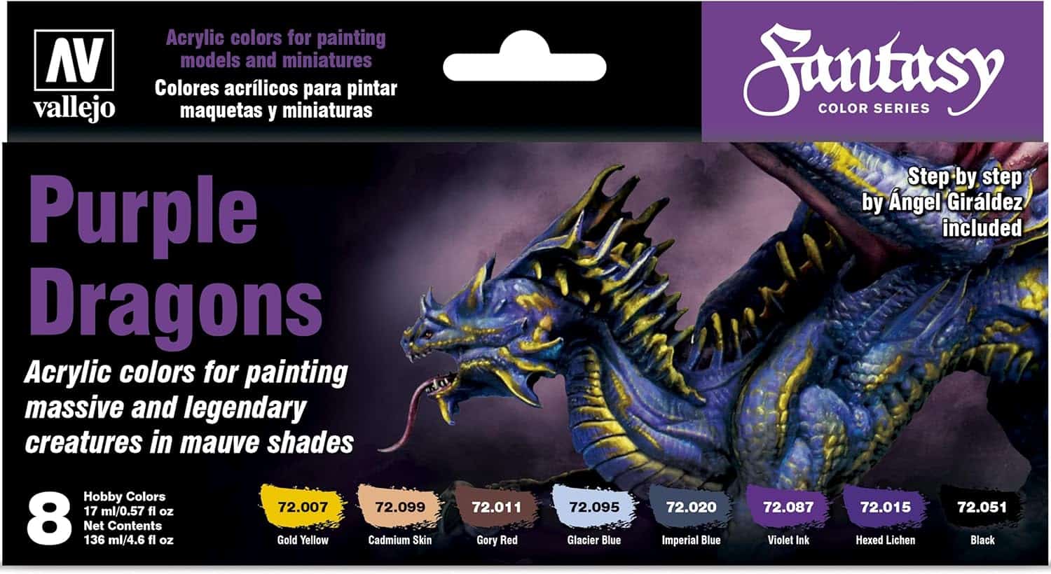 The Purple Dragons Paint Set contains eight Game Colors for painting purple dragons. It also includes detailed step-bystep instructions by Angel Giraldez. Contents: Each 17ml 72007,72099,72011,72095,72020,72087,72015,72051.